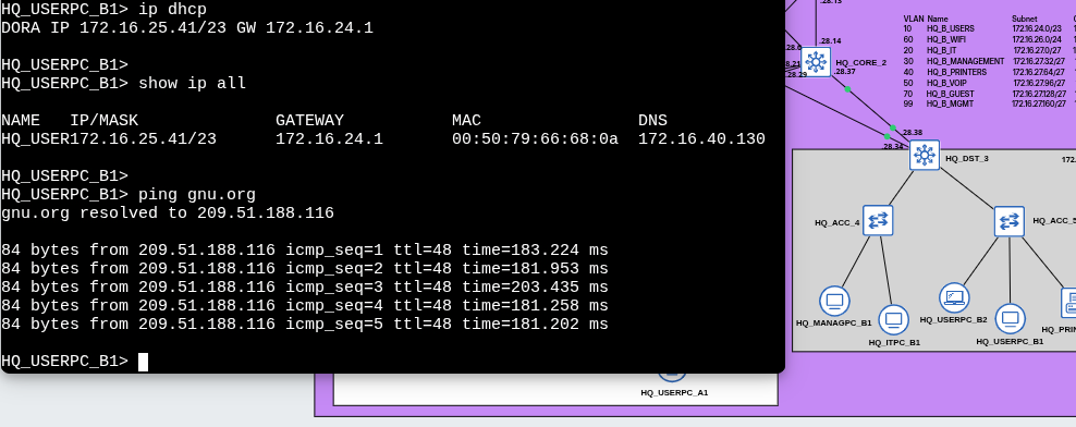 | HQ | 300 | ~700 | 172.16.16.0/19 |