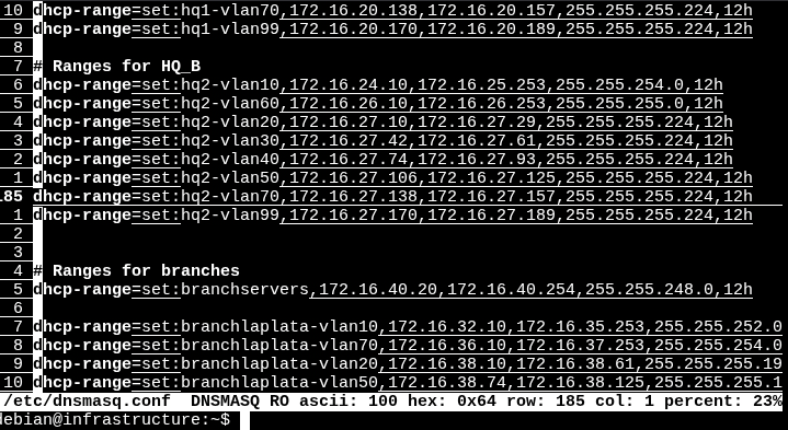 - An infrastructure server providing an internal DNS service (using dnsmasq). Additionally, it has a DHCP service running that provides per VLAN host configuration. Each subnet of every branch has its own address pool, default gateway, DNS server address, and domain name.