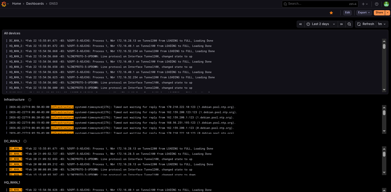 Monitoring was centralized using Loki + Grafana to visualize logs on an external Raspberry Pi 4 outside the GNS3 network, simulating Grafana in the cloud.