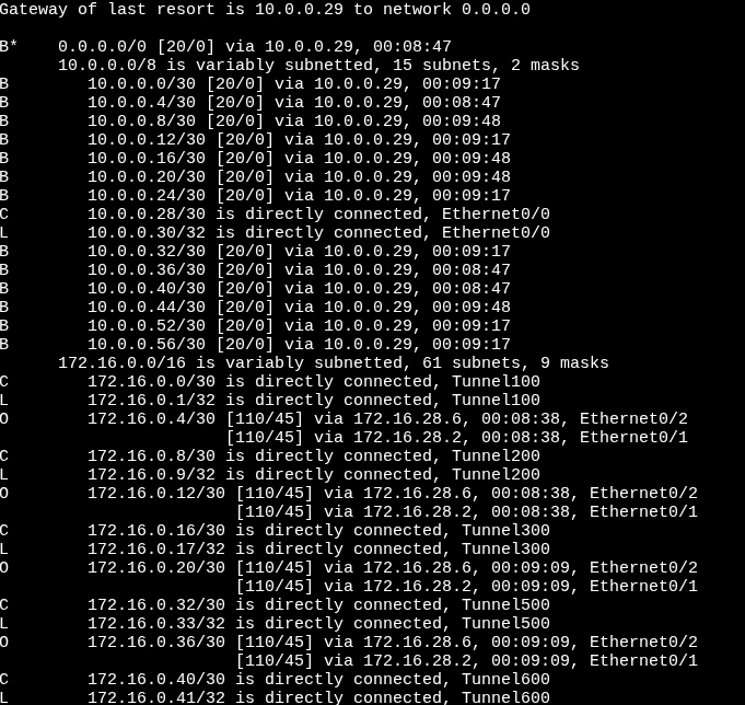localhost). - On several occasions, OSPF did not form adjacencies over IPsec. After extensive troubleshooting, I discovered the problem was that the branches were not running BGP (which was intentional), so I added a static route and the issue was resolved.