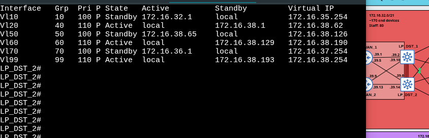 Spanning Tree was also tuned so that the root bridge matches the switch acting as the HSRP active device for each VLAN. In some VLANs, a switch may be both root bridge and HSRP active, while in others it may not be the root bridge and operate as HSRP standby.